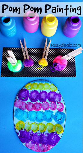 Σχεδιάστε με τον μαύρο μαρκαδόρο το σχέδιο (ένα αυγό, ένα κουνελάκι κπλ). Πιάστε με τα μανταλάκια τα πομ – πομ και βουτήξτε τα στα δοχεία με τις τέμπερες. Έπειτα μπορείτε να ζωγραφίσετε το σχέδιο σας.