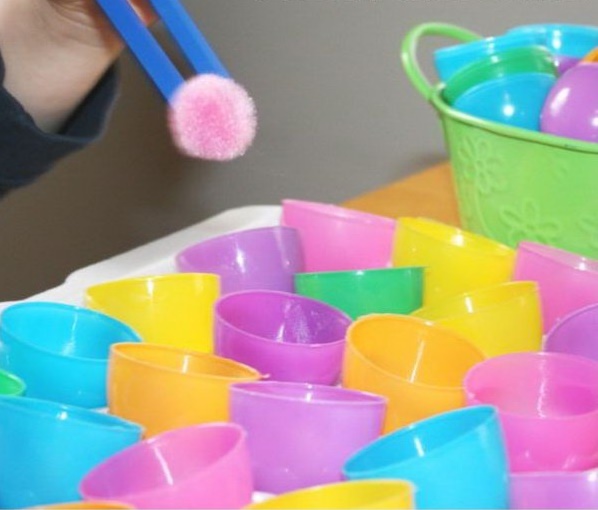 Χρησιμοποιήστε χρωματιστά πλαστικά αυγά, χρωματιστά πομ – πομ και μια τσιμπίδα.